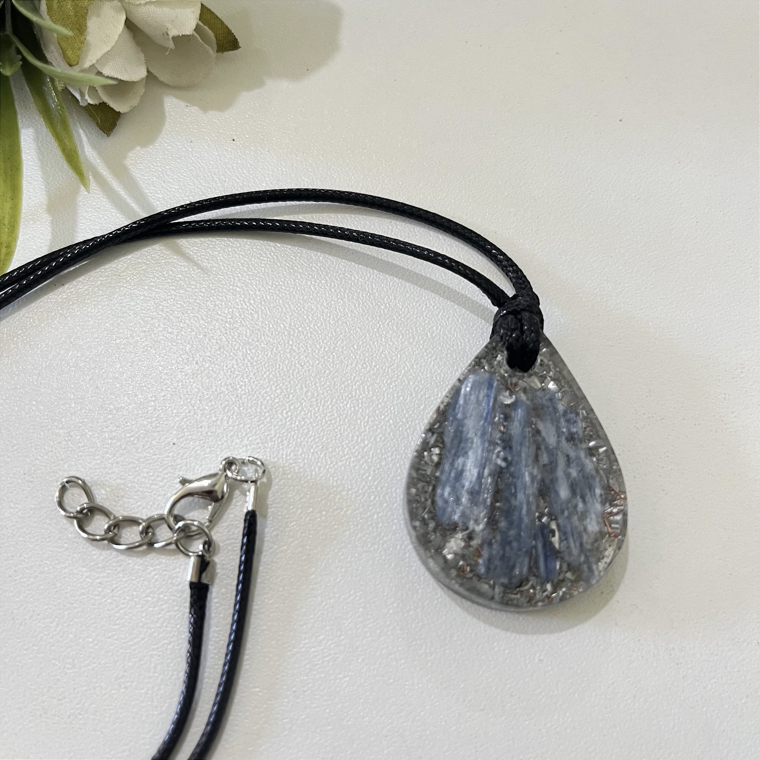 Este colar com cianita azul foi criado para promover alinhamento energético, clareza mental e comunicação consciente, atuando diretamente nos chakras da garganta e do terceiro olho.