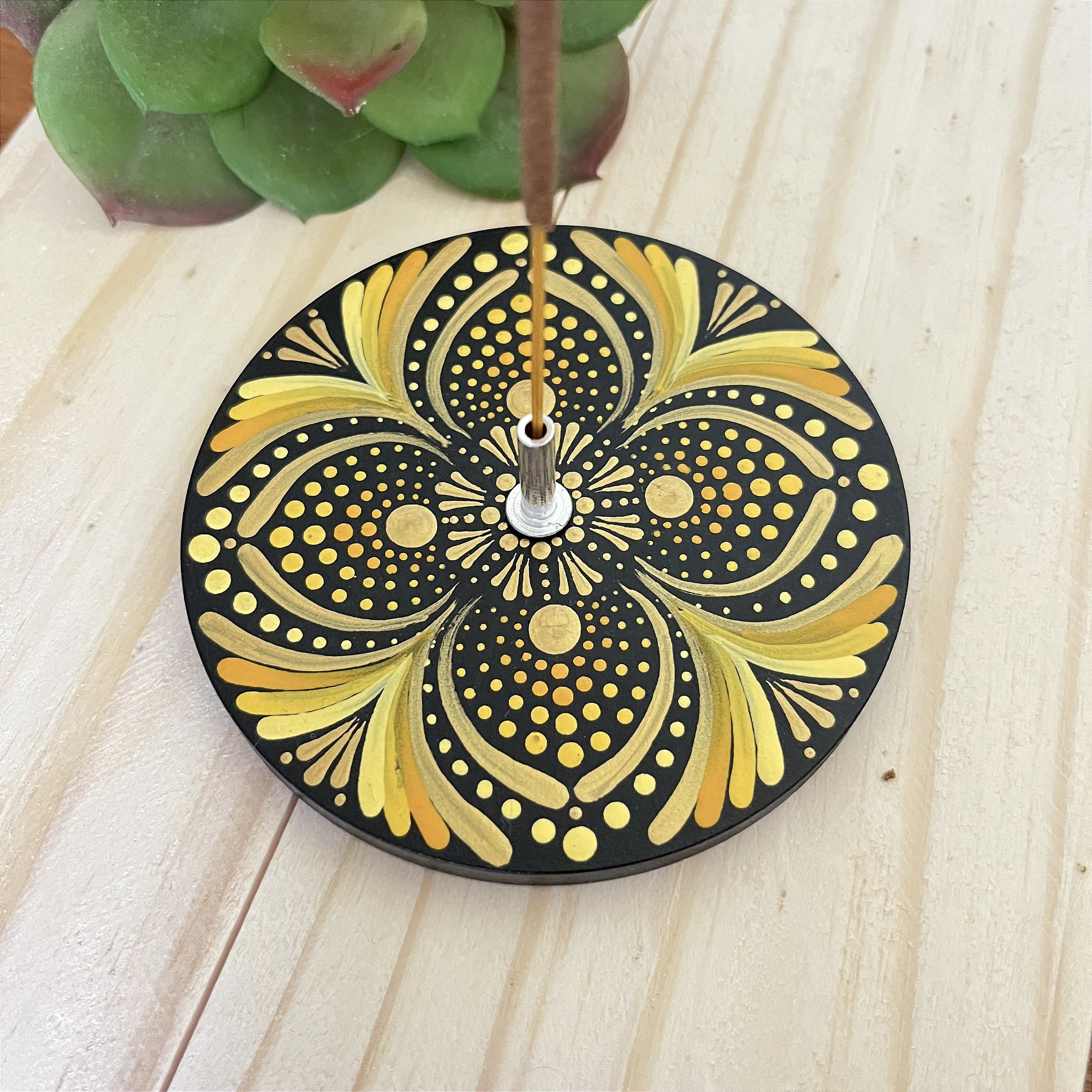 Pintado 100% à mão em pontilhismo, cada ponto é aplicado com intenção, transformando o uso do incenso em um ritual de presença, foco e expansão.